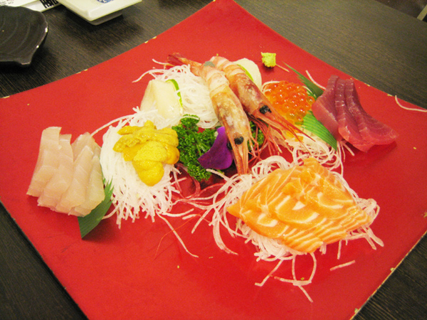 (生魚片拼盤,由左至右應該是O魚、海膽、干貝、牡丹蝦、鮭魚、鮭魚卵、鮪魚)