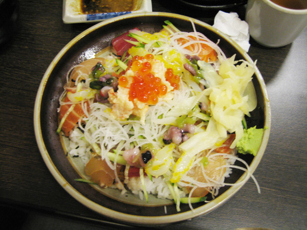 主角終於上場了,仔細一看,白飯上面蓋滿了魚肉、章魚塊、鮭魚卵、龍蝦沙拉、蘿蔔絲、軟絲、小黃瓜、醃薑片等料
