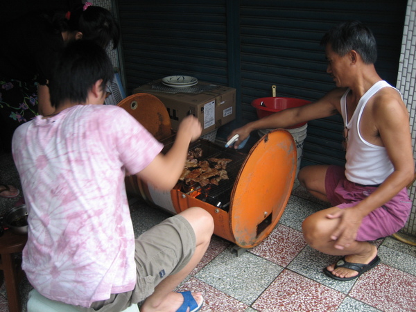 (A魔正,汽油桶烤肉架,大毛爸在烤肉 @走廊)