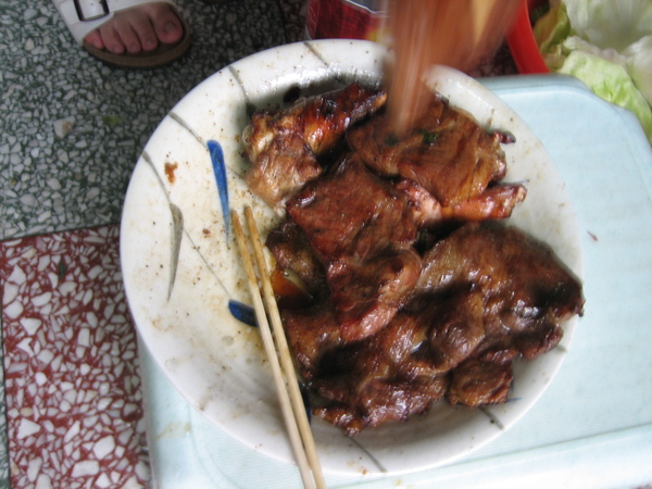 (烤好的肉,右上角是美生菜,包在一起很好吃)